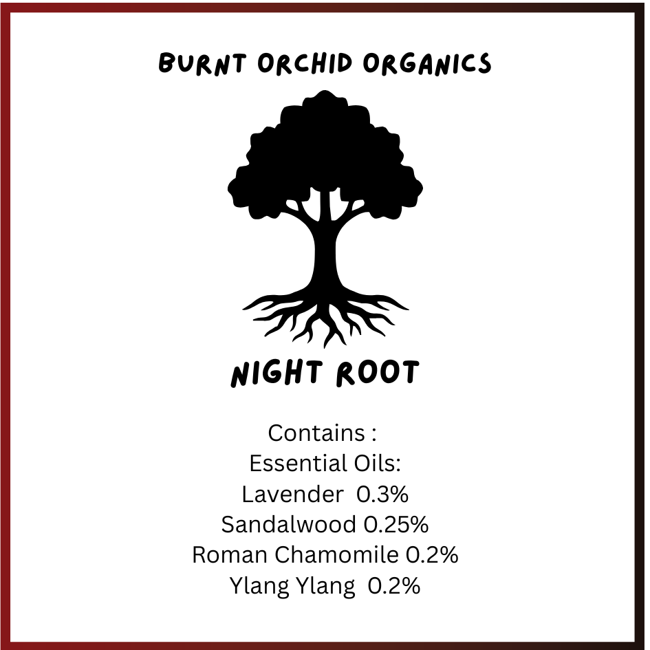 Nightroot: Evening use for racing thoughts and sleep difficulties. Contains: Lavender, Sandalwood, Roman Chamomile and Ylang Ylang