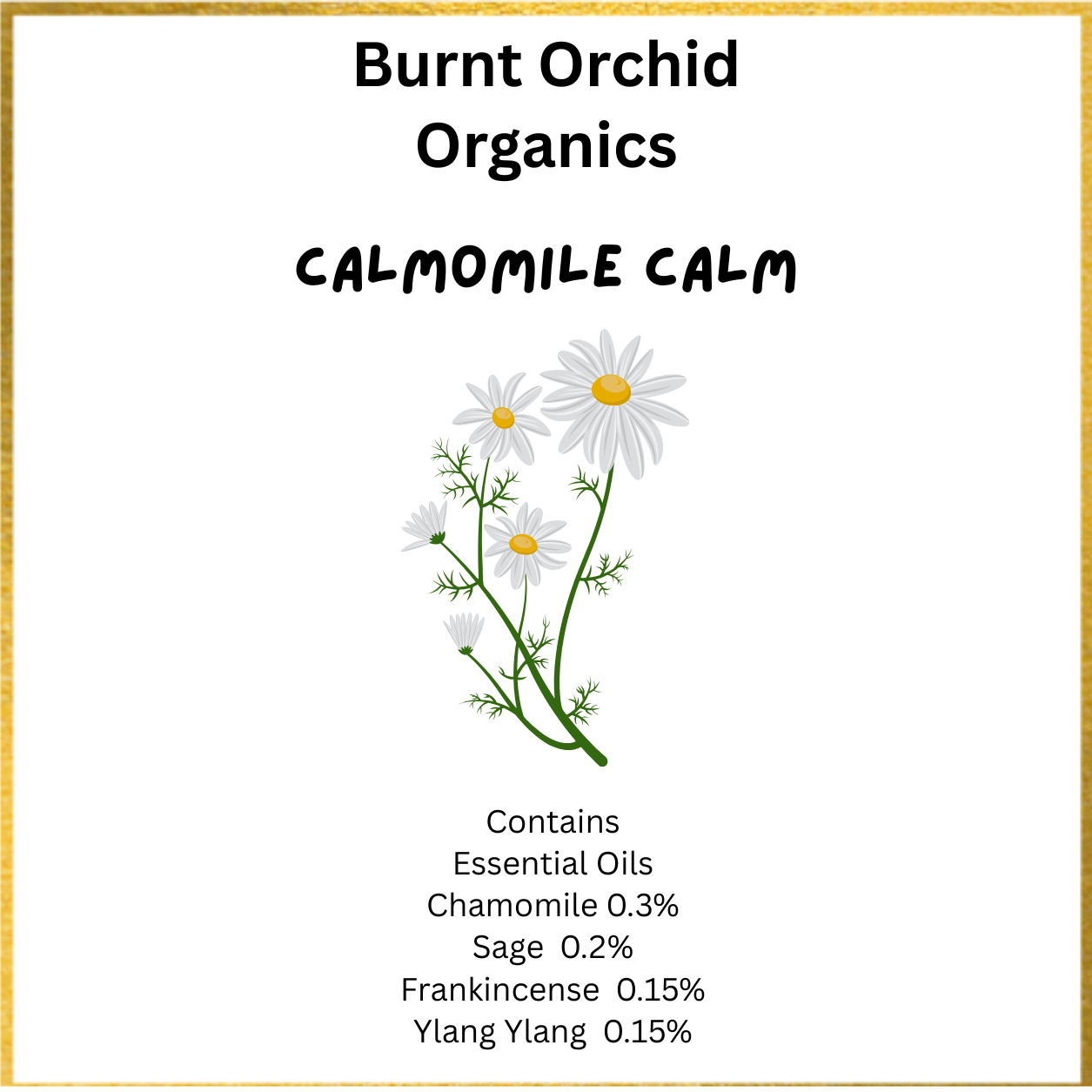 Camomile Calm: For anxiety-related sleep difficulties and emotional regulation. Contains: Roman Chamomile, Sage, Frankincense and Ylang Ylang